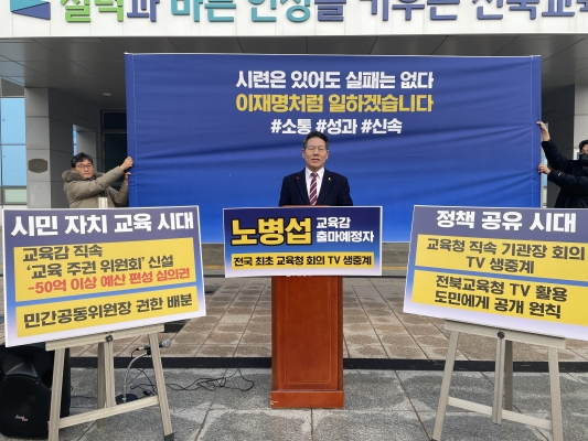 그는 "교육은 공공의 영역이며 행정은 도민의 신뢰 위에서 작동해야 한다"며 "교육감이 되면 기관장 회의를 포함한 교육청 주요 회의를 전국 최초로 TV 생중계하겠다"고 밝혔다.