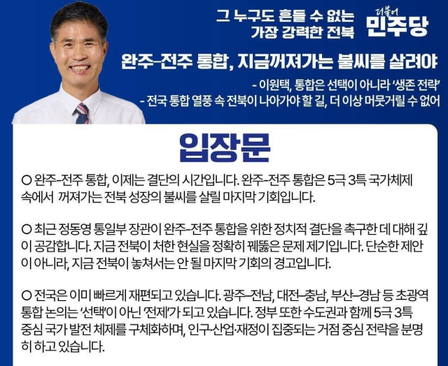그는 "통합은 행정구역의 문제가 아니라 지방 성장의 문제이자 인구를 모으고 산업을 키우며 재정을 확충하고 청년과 기업이 선택하는 도시로 나가기 위한 필수조건"이라며 "통합을 미루는 것은 곧 전북의 성장 기회를 스스로 포기하는 일"이라고 말했다.