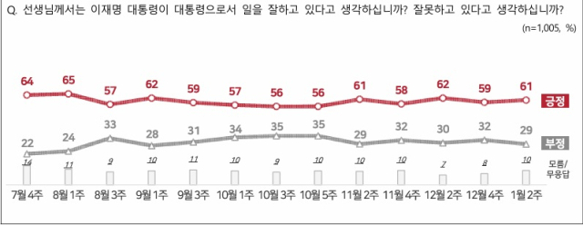 이재명 대통령의 국정운영에 대해 '잘하고 있다'는 긍정 평가가 61%로 집계됐다는 여론조사 결과가 8일 나왔다.