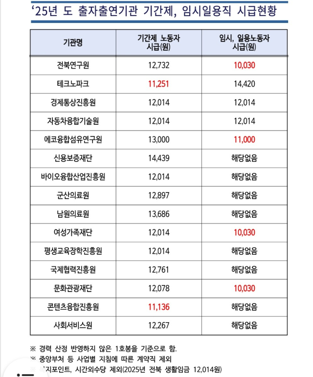 전북도 산하 최대 출연기관인 전북테크노파크의 경우 기간제 노동자 시급을 1만1251원으로 적용해 전북도의 '2025년 생활임금(1만2014원)'보다 턱없이 적어 파장이 일고 있다.