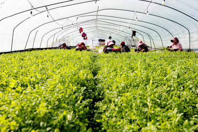 의령 자굴산 기슭 가례면 일대 밭미나리 비닐하우스에서는 14일 농민들이 겨울 추위를 이겨내며 밭미나리 수확에 구슬땀을 흘리고 있다.