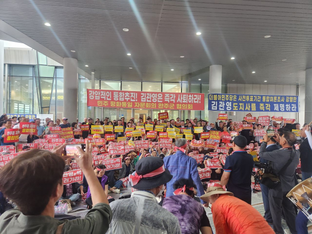김관영 전북자치도지사가 15일 완주·전주 통합과 관련해 "도지사가 소통에 미흡했다는 질타와 완주군민들의 마음을 깊이 헤아리지 못했다는 지적에 대해 사과드린다"며 고개를 숙였지만 완주군의회의 입장은 크게 달라지지 않은 것으로 보인다.