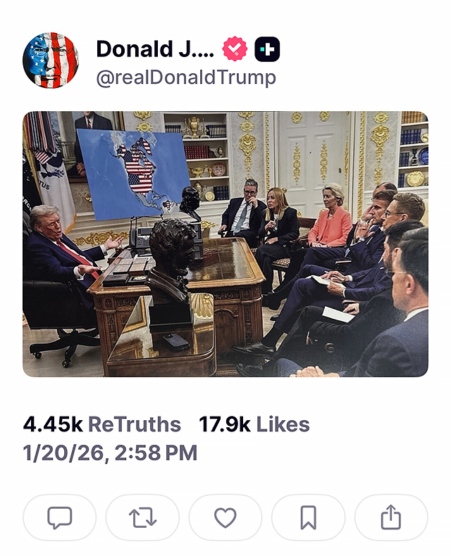 방송은 "트럼프 대통령의 이번 발언은 그가 과거에 했던 캐나다의 51번째 주 합병 발언을 떠올리게 하는, 캐나다와 그린란드 위에 성조기를 씌운 이미지를 소셜 미디어에 게시한 지 하루 만에 나온 것"이라고 짚었다. 실제 트럼프 대통령은 사회관계망서비스(SNS)인 '트루스소셜'의 본인 계정에 이같은 이미지를 게재하기도 했다.