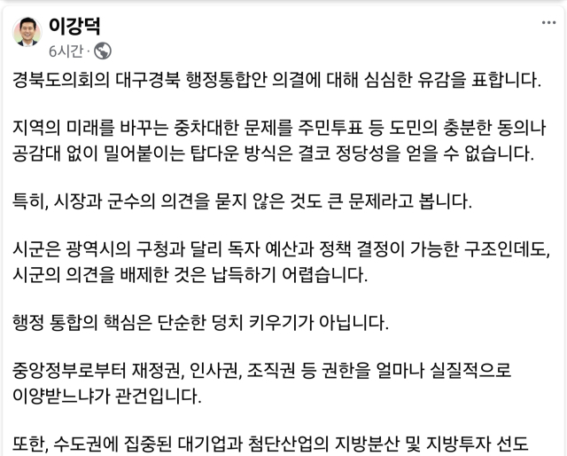 도의회 도기욱 의원은 “도민의 삶과 위상에 직결되는 사안임에도, 도민과 단 한 차례의 공식적 논의도 없이 통합을 기정사실화했다”며 “도의회와 충분한 협의 없이 대구시와 합의를 발표한 것은 절차적 정당성을 심각하게 훼손한 것”이라고 비판했다.