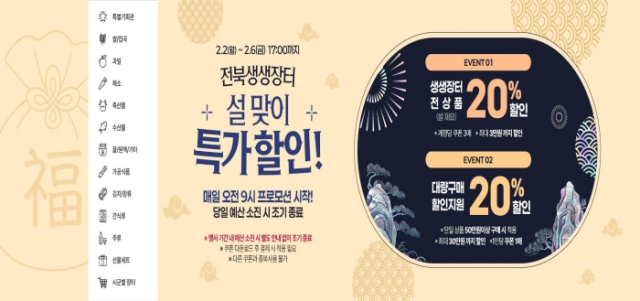 전북특별자치도는 2월 2일부터 6일까지 5일간 지자체 쇼핑몰 '전북생생장터'에서 설 명절 할인 기획전을 운영한다고 30일 밝혔다. 이번 기획전은 일부 품목을 제외한 전 상품을 대상으로 한다.