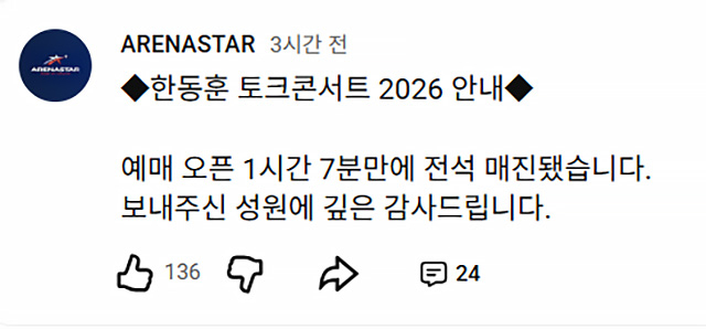 오는 8일 잠실 실내체육관에서 개최 예정인 한동훈 전 대표의 토크콘서트를 주관하는 기획사 '아레나스타'는 1일 오전 10시에 시작된 티켓 예매가 1시간 7분만에 매진됐다고 공식 유튜브 채널 공지를 통해 밝혔다. 이 콘서트 티켓은 R석 7만 9000원, S석 6만 9000원, A석 4만 5000원으로 구성됐다.