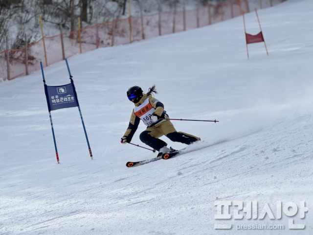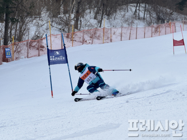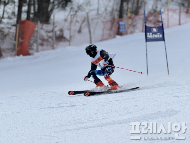 ▲4일 오전 제18회 전북특별자치도교육감배 학생 스키·스노보드대회에 참가한 한 학생 스키선수가 슬로프를 힘차게 활강하고 있다. ⓒ프레시안전북본부