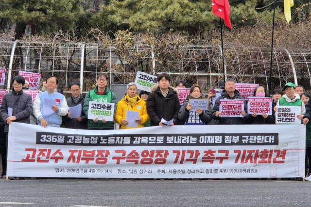 세종호텔 정리해고 철회를 위한 공동대책위원회는 4일 서울 서초 서울중앙지방법원 앞에서 '이재명 정부 1호 공권력 침탈, 집단 연행 고진수 지부장 영장 기각 촉구' 기자회견을 연 뒤 고 지부장의 석방 요구를 담은 탄원서를 법원에 전달했다.