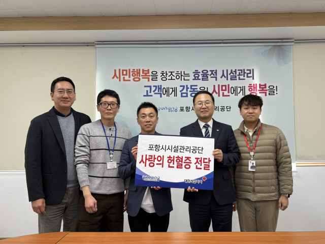 경북 포항시시설관리공단이 임직원들의 자발적 참여로 모은 헌혈증을 기부하며 생명 나눔에 동참했다.
