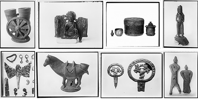 해당 유물 중 대표적인 것으로 위의 이미지와 같이 왼쪽 상단부터 차례대로 '수레모양토기', '금동일광삼존불상', '금동제삼층탑문사리합/은제타출보탑형사리기/은제타출당초문사리기/사리병', '금동보살입상', '접형 관식과 장신구 각종', '마형토우', '쌍룡문환두대도병두', '인물형토우' 등이 있었다. 이 유물들은 사리병을 제외하고 현재 도쿄국립박물관에 오구라 컬렉션으로 소장되어 있다.