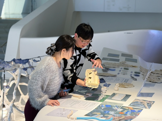 특히 작품에는 고현석 박사가 개발한 '건축 보강용 고속 경화형 고강도 무기 페이스트'소재 합성 기술이 굴패각과 더해져 활용되고 여기에 두 작가의 바이오 텍스타일이 가미돼 자문과 협력을 통해 예술 조형물로 재탄생했다.