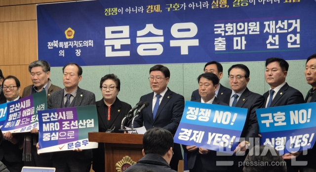 문승우 전북특별자치도의회 의장은 9일 오전 의회 브리핑룸에서 기자회견을 열고 군산시 국회의원 재선거 출마를 공식 선언했다.