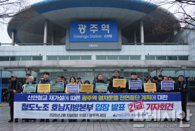 전국철도노동조합 호남지방본부는 10일 광주역 광장에서 기자회견을 열고 "국토교통부는 신안철교 재가설에 따른 광주역 열차 운행 전면 중단 계획을 즉각 철회하라"고 촉구했다.