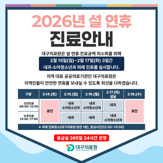 대구의료원(의료원장 김시오)이 설 연휴 기간의 응급실 운영을 강화하고, 15일(일)~17일(화) 3일간은 내과·소아청소년과 외래 진료를 실시한다.