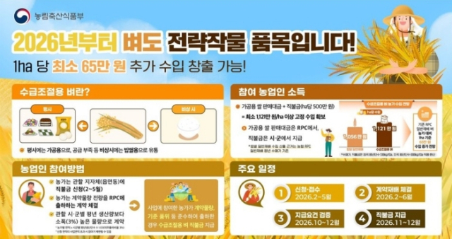 사업 참여를 희망하는 농업인은 오는 3월부터 5월 사이에 정읍시 농협조합공동사업법인(통합 RPC)과 '수급조절용 벼 출하 계약'을 체결해야 한다. 이후 같은 기간 내에 관할 읍·면·동 행정복지센터를 방문해 전략작물직불제를 신청하면 된다.