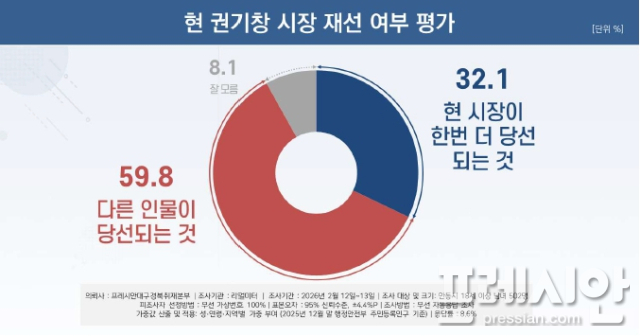한편 권기창 시장의 재선 여부에 대한 인식 조사에서는 ‘다른 인물이 당선되는 것이 좋다’는 응답이 59.8%로 과반을 넘었다. 안동시민 10명 중 6명가량이 새로운 인물에 대한 기대를 나타낸 가운데, ‘현 시장이 한 번 더 당선되는 것이 좋다’는 응답은 32.1%에 그쳤으며, 이는 ‘다른 인물 당선’ 응답보다 27.7%포인트 낮은 수치다. ‘잘 모름’은 8.1%로 조사됐다.