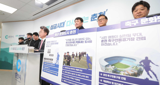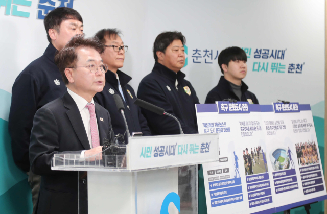 육동한 춘천시장은 24일 시청 브리핑룸에서 축구문화도시 춘천 종합계획을 발표하고 중·장기 축구 발전 전략을 설명했다.