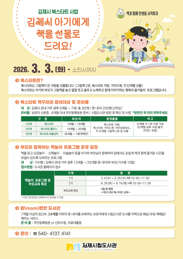 전북자치도 김제시립도서관이 3월 3일부터 지역 영·유아들의 올바른 독서 습관 형성을 돕기 위해 ‘북스타트 책꾸러미’ 배부 사업을 본격적으로 시작한다.
