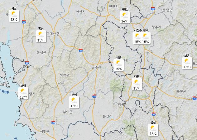 이날 낮 최고기온은 대전·천안 14도, 세종·청주 15도로 예보됐으며 아침 최저기온은 0도 안팎에 머물겠다.