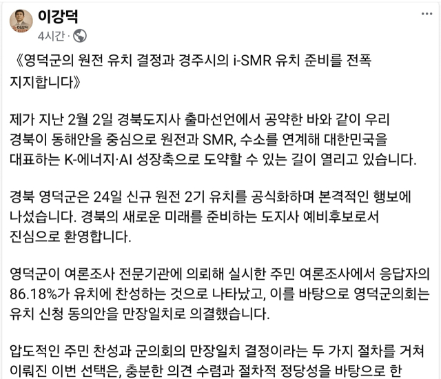 그는 “영덕에 신규 원전 2기, 경주에 i-SMR 1호기가 들어서면 울진·영덕·포항·경주로 이어지는 동해안 벨트가 K-에너지·AI 성장축으로 도약할 수 있다”며 “최종 결정 과정에서는 주민 동의가 최우선이어야 한다”고 밝혔다.