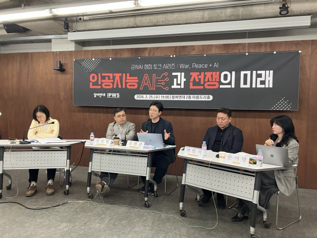 25일 저녁 서울 종로구 참여연대 느티나무홀에서 군사 AI쟁점 토크 시리즈 '인공지능과 전쟁의 미래' 토론회가 열렸다. 강성현·김현준 박사를 비롯해 백범석 경희대 법학전문대학원 교수, 문아영 피스모모 대표 등이 발표자로 참석했다.