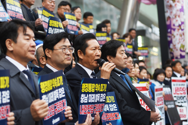 더불어민주당 충남도당은 1일 천안시 시외버스터미널 앞에서 '충남대전 미래말살 매향오적 규탄대회'를 열고 통합특별법의 조속한 처리를 촉구했다.