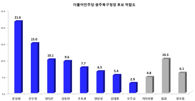 더불어민주당 후보들만을 대상으로 한 적합도에서도 문상필 부대변인이 21.6%로, 15.0%를 얻은 신수정 광주시의장 보다 6.6%p 앞서는 것으로 조사됐다.