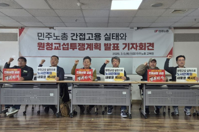 민주노총은 5일 서울 중구 민주노총 교육장에서 간접고용 실태 및 원청교섭 투쟁계획 발표 기자회견을 열었다.