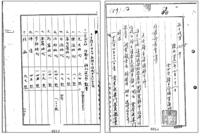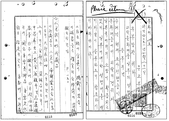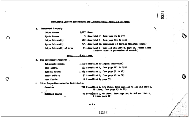 1958년 10월 1일부터 재개되었던 제4차 한일회담이 북송문제로 인해 1959년 1월에 중단되는데, 당시 한국 정부는 1959년 10월 7일에 '일본 소재 미술품 및 고고학 자료 누적 목록'을 포함한 지침을 주일대표부로 보낸다.