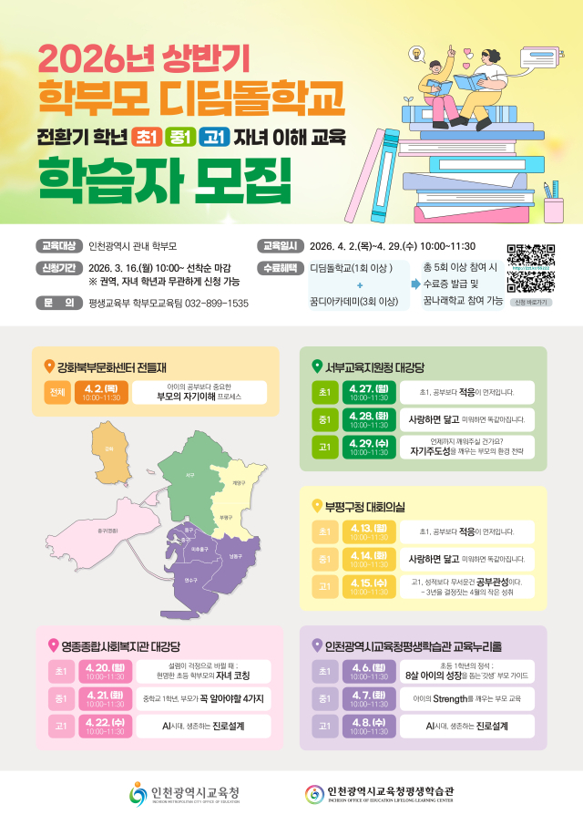 인천광역시교육청평생학습관은 초등학교 1학년과 중학교 1학년 및 고등학교 1학년 자녀의 학부모를 대상으로 ‘2026년 상반기 학부모 디딤돌학교’ 참여자를 모집한다고 16일 밝혔다.