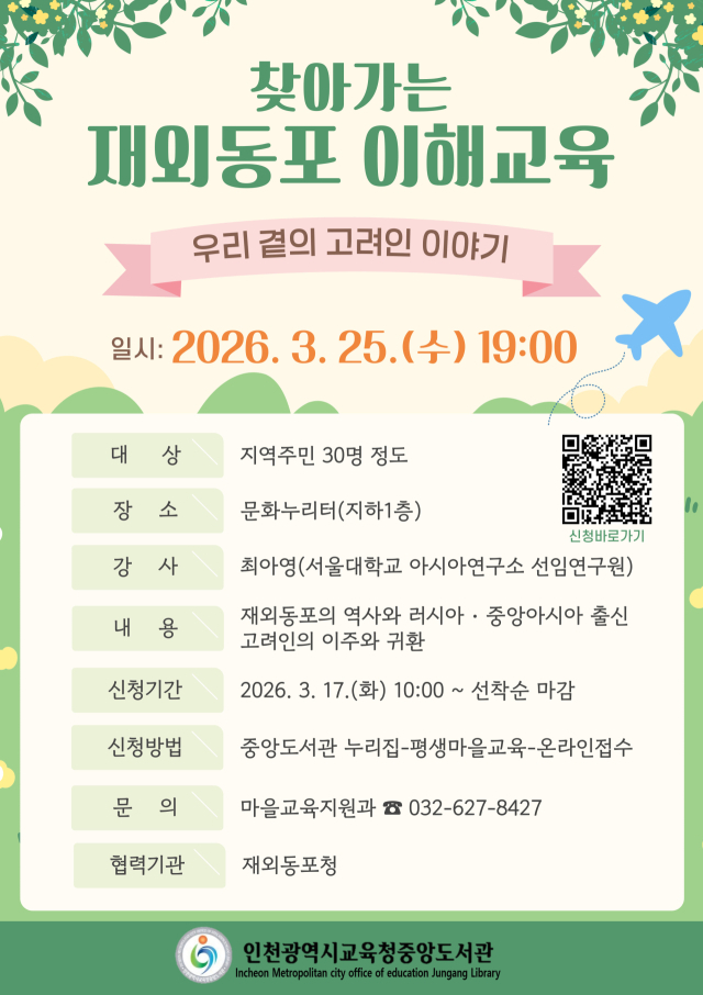 인천광역시교육청중앙도서관은 찾아가는 재외동포 이해교육 ‘우리 곁의 고려인 이야기’ 참여자를 모집한다.