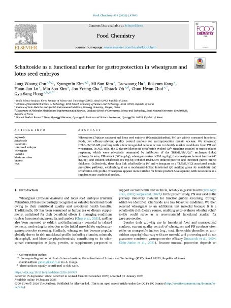 이번 연구 결과는 ‘밀싹과 연자심에서 위 보호 기능을 나타내는 지표 성분으로서의 셰프토사이드’라는 논문 제목으로 푸드 케미스트리에 게재됐다. 이 학술지는 영양·식품과학 분야에서 영향력 있는 국제 학술지로 상위 3.1% 수준에 해당한다.
