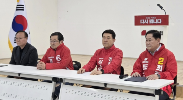 국민의힘 경북도지사 선거에 출마한 김재원·백승주·이강덕·최경환(가나다순) 예비후보가 19일 경북도당에서 기자회견을 열고 본경선 일정 연기를 요구했다.