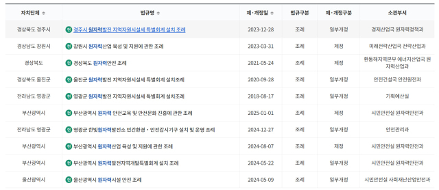 또한 원자력산업 육성과 기업 경쟁력 강화, 지역경제 활성화를 목적으로 하는 '원자력 산업 진흥 조례'는 경주, 창원, 부산 등에 제정돼 있으며, '원전 해체 산업 육성 조례'는 울산과 경북에 마련돼 있다. 부산의 경우, 문재인 정부 시절 고리 1호기 폐쇄 국면에서 제정됐던 '원전해체산업 육성 조례'가 이후 '원자력산업 육성 조례' 제정으로 폐기된 바 있다. 이는 핵발전소 영구정지 이후를 준비하는 방향에서 다시 기존 원자력 산업의 유지·확장으로 정책의 무게가 이동했음을 보여준다. 동시에 에너지 정책 방향이 정권 변화에 따라 흔들리며 일관성을 잃고 오락가락해 온 흐름 역시 드러낸다.