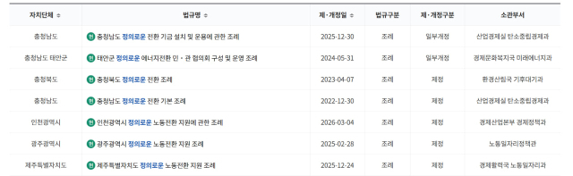 반면 정의로운 전환과 관련한 조례는 석탄화력발전소 지역인 충청남도와 충청북도, 태안군을 비롯해 전국 7곳에서 제정돼 있다. 정의로운 전환 또는 노동전환 지원을 위한 제도적 시도가 일부 지역에서 이루어지고 있는 셈이다. 물론 조례가 실제로 작동하고 이행되는 과정에서는 여러 한계가 존재한다. 그럼에도 이러한 논의와 제도적 시도조차 핵발전소 지역에서는 시작되지 못하고 있다는 점에서, 그 간극은 더욱 두드러진다.