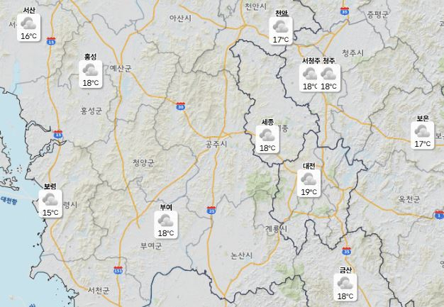 이날 낮 최고기온은 대전 19도, 세종·청주 18도, 천안 17도로 예보됐으며 아침 최저기온은 3도 안팎에 머물 것으로 보인다.