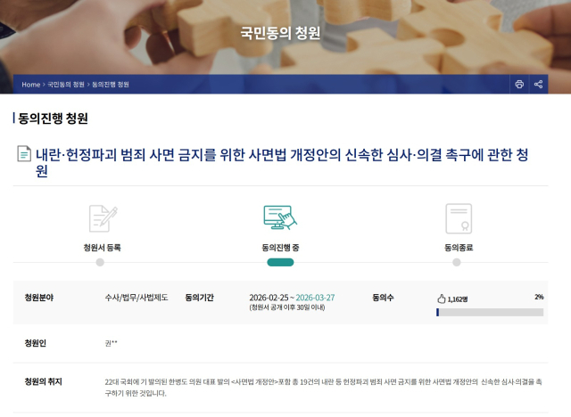 청원의 취지는 '22대 국회에 기 발의된 한병도 의원 대표 발의 <사면법 개정안>포함 총 19건의 내란 등 헌정파괴 범죄 사면 금지를 위한 사면법 개정안의 신속한 심사·의결을 촉구하기 위한 것'으로 이날 현재 1162명으로 기준 동의 청원인 수 5만 명의 2% 수준에 머물고 있다.