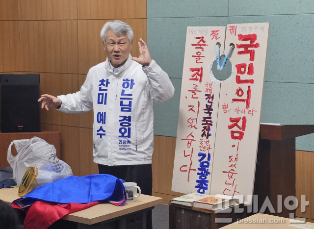 6·3 지방선거에서 국민의힘 전북도지사 후보공천을 신청한 김광종 전 우석대학교 기획부처장이 ‘칼’을 목에 건 퍼포먼스로 출마를 알렸다.