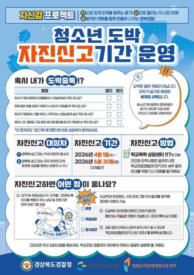 자진신고 대상은 경북에 거주하는 19세 미만 청소년으로, 신고는 국번 없이 117(학교폭력 신고센터)을 통해 가능하다. 자진신고가 접수되면 전문가 상담을 거쳐 상황에 따라 경찰의 선처가 검토되며, 이후 경북도박문제예방치유센터와 연계한 맞춤형 상담 및 치료 프로그램이 제공된다.