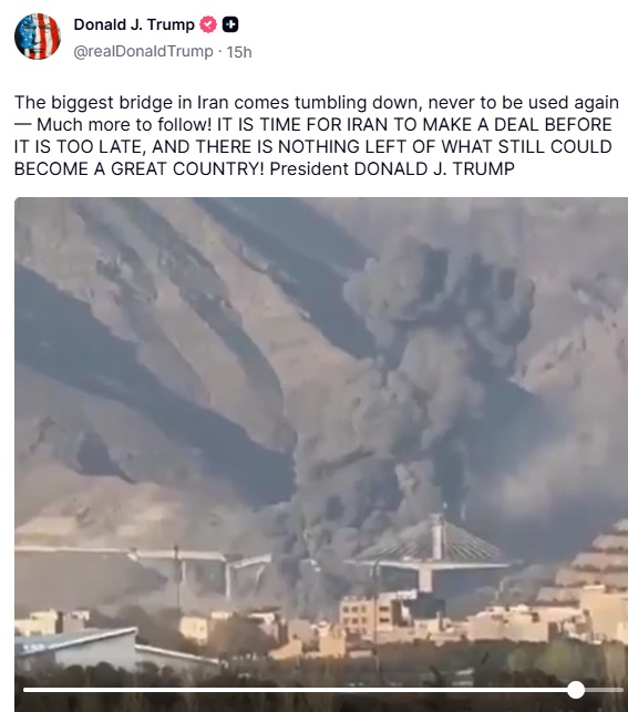앞서 트럼프 대통령은 이란의 최대 교량을 공격해 다리가 무너지는 영상을 공유하기도 했다.