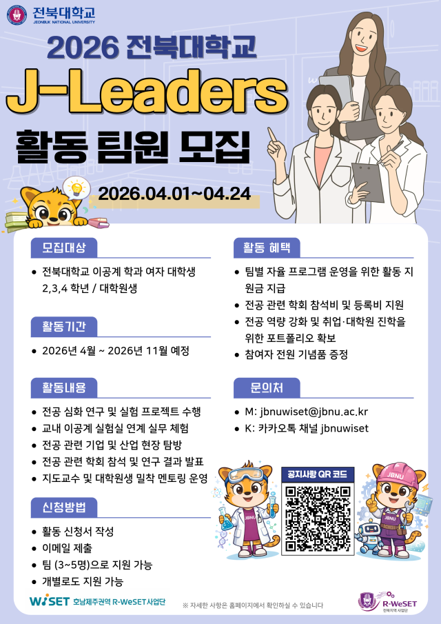 전북대는 이와 함께 차세대 여성 과학기술 리더 육성을 위한 ‘J-Leaders 프로그램’도 추진한다. 오는 24일까지 이공계 학과 학부 2~4학년과 대학원생을 대상으로 참여자를 모집하며, 선발된 학생들은 연구 프로젝트 수행과 실험실 연계 실무 체험, 산업 현장 탐방, 연구 성과 발표 등에 참여하게 된다.