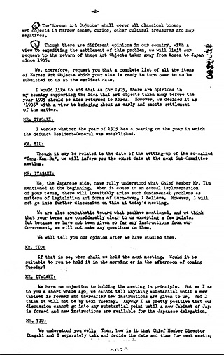 B. 국내에는 서로 다른 의견이 있지만, 이 문제를 신속하게 해결하기 위해 한국에서 일본으로 빼앗긴 미술품의 반환 요구를 1905년 이후로 한정한다. 따라서 귀측이 우리에게 인도할 준비가 되어 있는 모든 한국 예술품의 목록을 가능한 한 조속히 제출해 줄 것을 요청한다. 1905년에 대해 덧붙이자면, 국내에는 1905년 이전에 빼앗긴 미술품도 한국에 반환되어야 한다는 생각을 지지하는 의견도 있다. 그런데, 우리는 이 문제의 조속하고 원만한 해결을 위해 1905년을 기준으로 결정했다.
