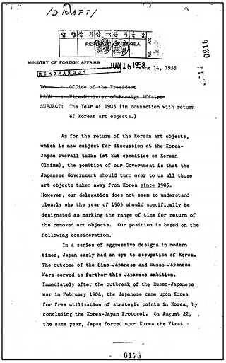 이에 대해 일본 측은 '1905년의 언제인가, 통감부 설치 날짜인가?'라고 질의했고, 한국 측은 확인한 후 설명하겠다고 답변했다.