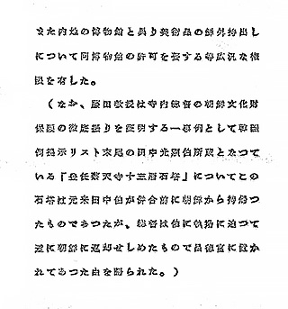 1907년에 일본 황실에서 다나카(田中) 자작이 한국 황태자 결혼식에 참가하러 왔을 때 그는 풍덕(豊德)에 있는 아름다운 오래된 탑을 선물로 요구했다. 왕이 분개하여 거절하자 다나카는 무장한 일본군을 보내 탑을 분해하고 배로 일본에 보냈다. 이것은 일본이 한국에서 함부로 국보를 뒤적이며 찾았던 방법을 예로 든 것이며, 1910년의 합병 이전에도 그러했다. 1905년 이후 많은 한국 국보가 일본인 침략자에 의해 일본으로 빼앗겼다. 없어진 한국 예술품의 반환 기간은 1905년으로 설정해야 한다.