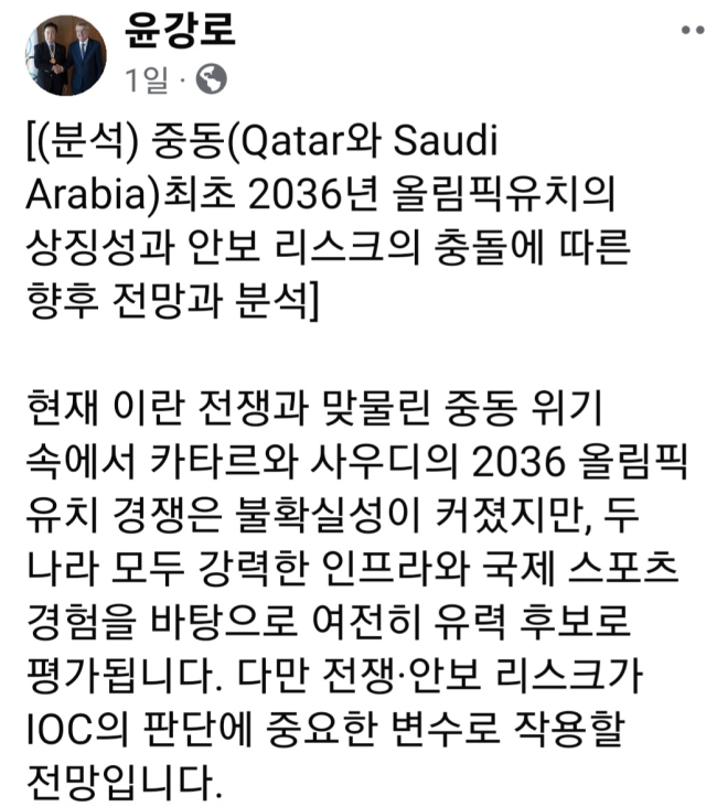 올림픽과 관련한 국내 최고 전문가로 알려진 윤강로 국제스포츠외교연구원장이 최근 자신의 페이스북에 '중동(카타르와 사우디아라비아) 최초 2036년 올림픽 유치의 상징성과 안보 리스크의 충돌에 따른 향후 전망과 분석'을 내놓아 관심을 끈다.