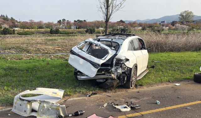 11일 오후 5시 24분께 경북 경주시 동천동 도로에서 달리던 승용차가 가드레일을 들이받고 5m 아래 하천 옆 자전거도로로 추락했다.