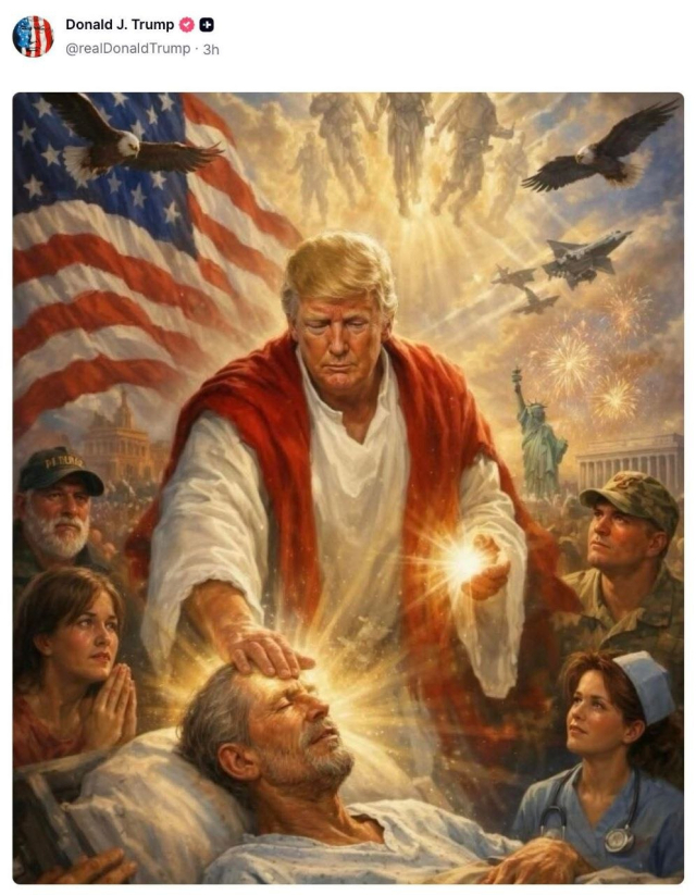 성스러운 빛이 감도는 옷을 걸치고 고통받는 자를 치유하는 형상. 그 성화(聖畵) 속 예수의 얼굴을 대신한 것은 다름 아닌 도널드 트럼프였다. 믿기 힘든 광경이지만, 이는 그가 직접 자신의 플랫폼인 '트루스소셜'에 게시한 엄연한 현실이다. 이 기괴한 이미지는 단순한 정치적 선전을 넘어, 우리 시대가 직면한 일그러진 성상(聖像) 숭배의 단면을 적나라하게 보여준다.