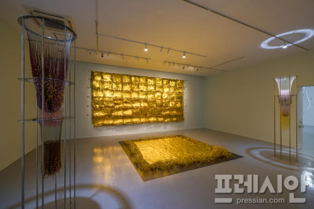 실제 최성임 작가의 대표작 ‘황금 이불’은 수 많은 빵 끈을 교차해 엮어낸 설치 작품으로, 따뜻함과 뻣뻣한 구조 및 물질성과 비물질성 사이의 긴장을 통해 눈에 보이지 않지만 삶을 지탱하는 힘을 드러내며 반복되는 노동과 시간 및 돌봄의 가치를 시각화했다.