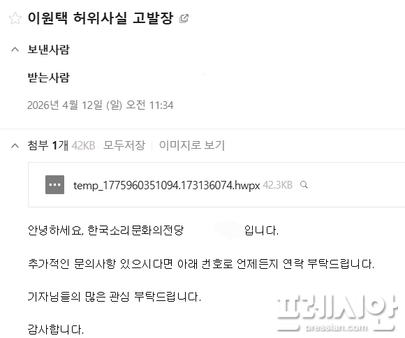 이번 논란은 소리전당 직원이 공식 이메일을 통해 더불어민주당 전북도지사 후보인 이원택 의원 관련 고발장을 출입기자들에게 발송하면서 불거졌다. 이후 전당 측은 “개인의 부탁으로 전달된 것”이라며 기관과는 무관하다는 입장을 밝히고, 내부 규정 위반 여부를 검토 중이다.
