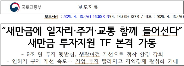 국토교통부 이날 오후 정부세종청사에서 ‘새만금 투자지원 TF’를 출범시키면서 "이번 TF는 지난 2월 투자협약식에서 현대차그룹이 발표한 9조 원 규모의 새만금 투자 계획(로봇·수소·AI도시 등)이 신속하게 실현될 수 있도록 지원하기 위해 구성했다."고 밝혔다.